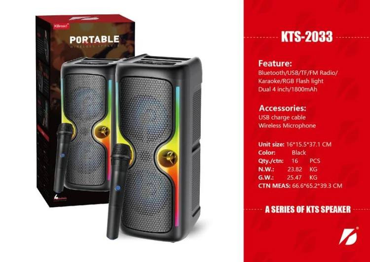 اسپیکر پرتابل KTS-2033 یک دستگاه ایدهآل برای برگزاری هر نوع مهمانی و دورهمی است که صدای قدرتمند و قابلیتهای سرگرمی را در یک پکیج شیک و قابل حمل ارائه میدهد. این اسپیکر بلوتوثی کارائوکه با بهرهگیری از دو بلندگوی ۴ اینچی، صدایی شفاف با باس عمیق را تضمین میکند و رقص نور جذاب RGB، هیجان هر محیطی را دوچندان میسازد. به لطف اتصال بلوتوث و ورودیهای متنوع (USB، AUX و TF)، پخش موسیقی از هر دستگاهی آسان است و ویژگی TWS به شما اجازه میدهد تا دو اسپیکر را برای تجربهی صدای استریو فراگیر به هم متصل کنید. همراه با میکروفون بیسیم کارائوکه، KTS-2033 تبدیل به بهترین انتخاب برای آوازخوانی و سرگرمیهای خانوادگی میشود. اگر به دنبال خرید اسپیکر شارژی باکیفیت و مقرونبهصرفه هستید، این مدل گزینهای بینقص و چندمنظوره برای شما خواهد بود.